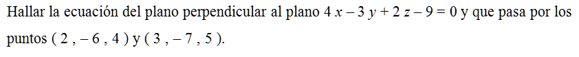 Hallar la ecuación del plano perpendicular al plano 4 x – 3 y + 2 z – 9 = 0 y que pasa por los puntos ( 2 , – 6 , 4 ) y ( 3 , – 7 , 5 ).