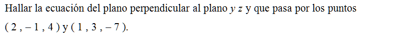 Hallar la ecuación del plano perpendicular al plano y z y que pasa por los puntos ( 2 , – 1 , 4 ) y ( 1 , 3 , – 7 ).