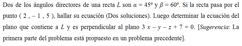 Dos de los ángulos directores de una recta L son α = 45º y β = 60º. Si la recta pasa por el punto ( 2 , – 1 , 5 ), hallar su ecuación (Dos soluciones). Luego determinar la ecuación del plano que contiene a L y es perpendicular al plano 3 xyz + 7 = 0. [Sugerencia: La primera parte del problema está propuesto en un problema precedente].