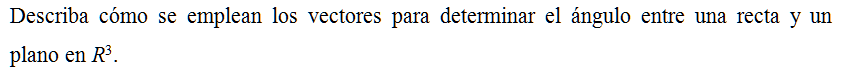 Describa cómo se emplean los vectores para determinar el ángulo entre una recta y un plano en R3.