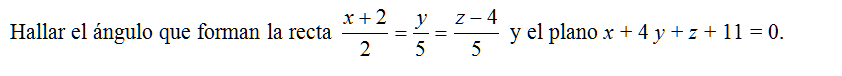 Hallar el ángulo que forman la recta \( \displaystyle \frac{x+2}{2}=\frac{y}{5}=\frac{z-4}{5}\) y el plano x + 4 y + z + 11 = 0.