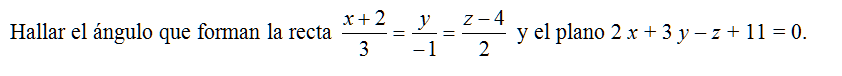 Hallar el ángulo que forman la recta \( \displaystyle \frac{x+2}{3}=\frac{y}{-1}=\frac{z-4}{2}\) y el plano 2 x + 3 y – z + 11 = 0.