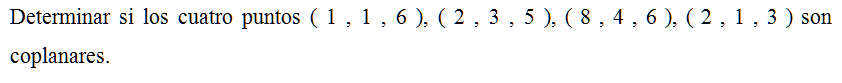 Determinar si los cuatro puntos ( 1 , 1 , 6 ), ( 2 , 3 , 5 ), ( 8 , 4 , 6 ), ( 2 , 1 , 3 ) son coplanares.