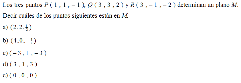 Los tres puntos P ( 1 , 1 , – 1 ), Q ( 3 , 3 , 2 ) y R ( 3 , – 1 , – 2 ) determinan un plano M. Decir cuáles de los puntos siguientes están en M.
