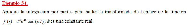 Aplique la integración por partes para hallar la transformada de Laplace de la función f(t) = t2 eat cos (kt); k es una constante real