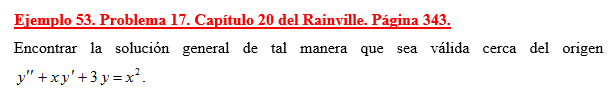 Encontrar la solución general de tal manera que sea válida cerca del origen \( \displaystyle y^{\prime\prime}+xy^{\prime}+3y=x^2\).