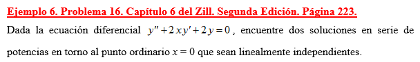 Dada la ecuación diferencial \( \displaystyle y^{\prime\prime}+2xy^{\prime}+2y=0\), encuentre dos soluciones en serie de potencias en torno al punto ordinario x = 0 que sean linealmente independientes.