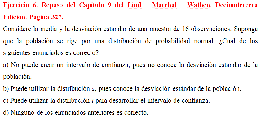 Considere la media y la desviación estándar de una muestra de 16 observaciones. Suponga que la población se rige por una distribución de probabilidad normal. ¿Cuál de los siguientes enunciados es correcto?