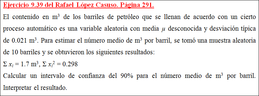Calcular un intervalo de confianza del 90% para el número medio de m3 por barril. Interpretar el resultado.