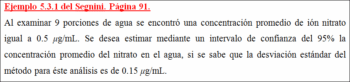 Al examinar 9 porciones de agua se encontró una concentración promedio de ión nitrato igual a 0.5 μg/mL. Se desea estimar mediante un intervalo de confianza del 95% la concentración promedio del nitrato en el agua, si se sabe que la desviación estándar del método para éste análisis es de 0.15 μg/mL.