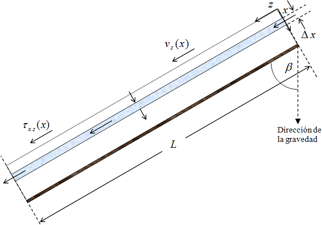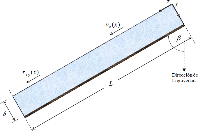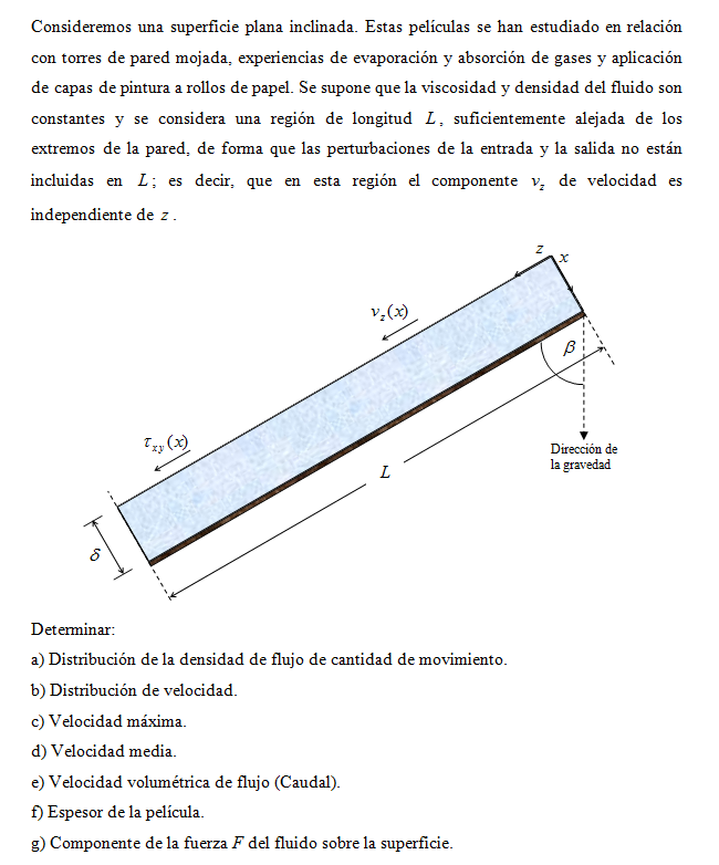 Flujo de una película descendente. Consideremos una superficie plana inclinada. Estas películas se han estudiado en relación con torres de pared mojada, experiencias de evaporación y absorción de gases y aplicación de capas de pintura a rollos de papel. Se supone que la viscosidad y densidad del fluido son constantes y se considera una región de longitud L, suficientemente alejada de los extremos de la pared, de forma que las perturbaciones de la entrada y la salida no están incluidas en L; es decir, que en esta región el componente vz de velocidad es independiente de z.