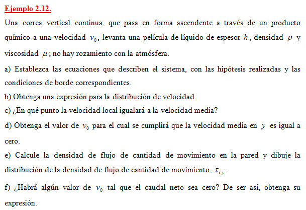 Una correa vertical continua, que pasa en forma ascendente a través de un producto químico a una velocidad v0, levanta una película de líquido de espesor h, densidad ρ y viscosidad μ; no hay rozamiento con la atmósfera.