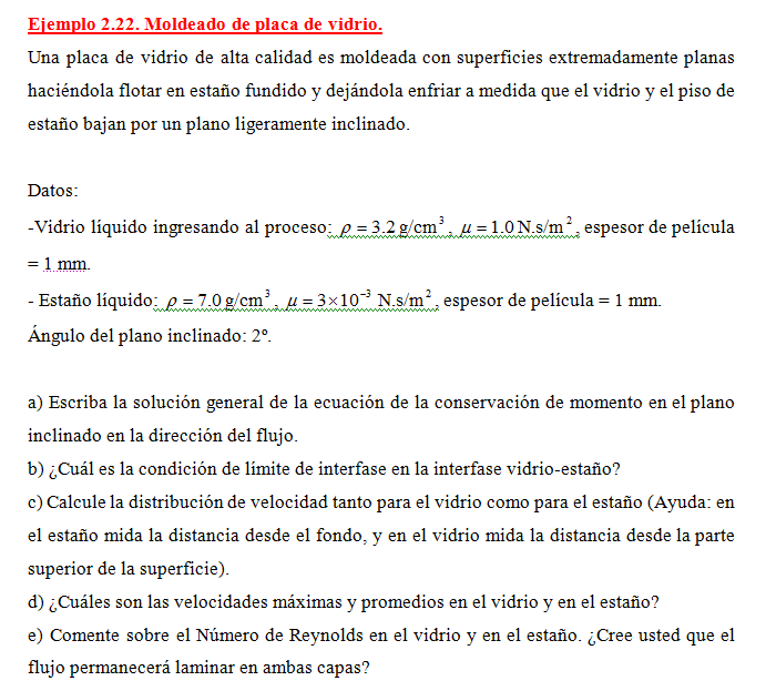 – Vidrio líquido que entra al proceso: ρ = 3.2 g/cm3, μ = 1.0 N.s/m2, espesor de capa = 1 mm.