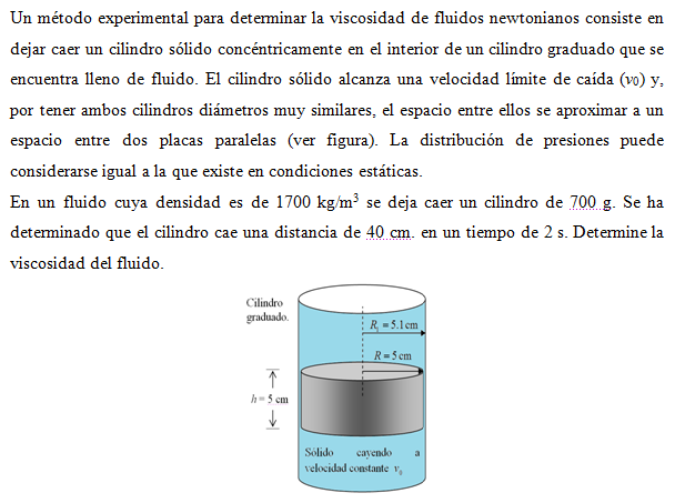 Un método experimental para determinar la viscosidad de fluidos newtonianos consiste en dejar caer un cilindro sólido concéntricamente en el interior de un cilindro graduado que se encuentra lleno de fluido. El cilindro sólido alcanza una velocidad límite de caída (v0) y, por tener ambos cilindros diámetros muy similares, el espacio entre ellos se aproximar a un espacio entre dos placas paralelas (ver figura). La distribución de presiones puede considerarse igual a la que existe en condiciones estáticas.