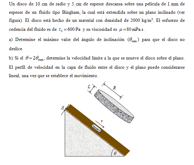 Un disco de 10 cm de radio y 5 cm de espesor descansa sobre una película de 1 mm de espesor de un fluido tipo Bingham, la cual está extendida sobre un plano inclinado (ver figura). El disco está hecho de un material con densidad de 2000 kg/m3. El esfuerzo de cedencia del fluido es de y su viscosidad es μ = 80 MPa.s.