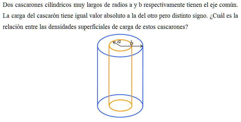 Dos cascarones cilíndricos muy largos de radios a y b respectivamente tienen el eje común. La carga del cascarón tiene igual valor absoluto a la del otro pero distinto signo. ¿Cuál es la relación entre las densidades superficiales de carga de estos cascarones?