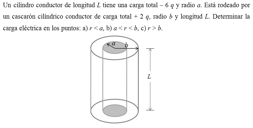 Un cilindro conductor de longitud L tiene una carga total – 6 q y radio a. Está rodeado por un cascarón cilíndrico conductor de carga total + 2 q, radio b y longitud L. Determinar la carga eléctrica en los puntos: a) r < a, b) a < r < b, c) r > b.
