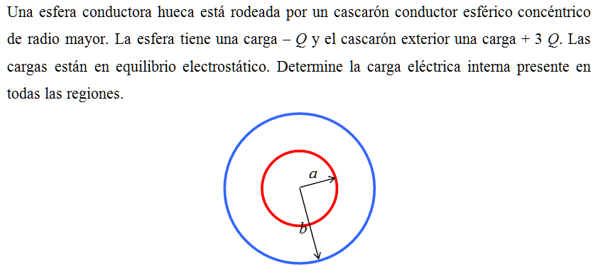 Una esfera conductora hueca está rodeada por un cascarón conductor esférico concéntrico de radio mayor. La esfera tiene una carga – Q y el cascarón exterior una carga +3Q. Las cargas están en equilibrio electrostático. Determine la carga eléctrica interna presente en todas las regiones.