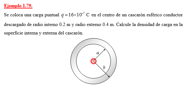 Se coloca una carga puntual q = 16×10–7 C en el centro de un cascarón esférico conductor descargado de radio interno 0.2 m y radio externo 0.4 m. Calcule la densidad de carga en la superficie interna y externa del cascarón.
