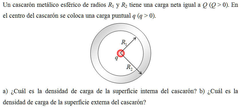 Un cascarón metálico esférico de radios R1 y R2 tiene una carga neta igual a Q (Q > 0). En el centro del cascarón se coloca una carga puntual q (q > 0).