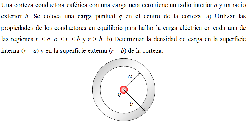 Una corteza conductora esférica con una carga neta cero tiene un radio interior a y un radio exterior b. Se coloca una carga puntual q en el centro de la corteza. a) Utilizar las propiedades de los conductores en equilibrio para hallar la carga eléctrica en cada una de las regiones r < a, a < r < b y r > b. b) Determinar la densidad de carga en la superficie interna (r = a) y en la superficie externa (r = b) de la corteza.
