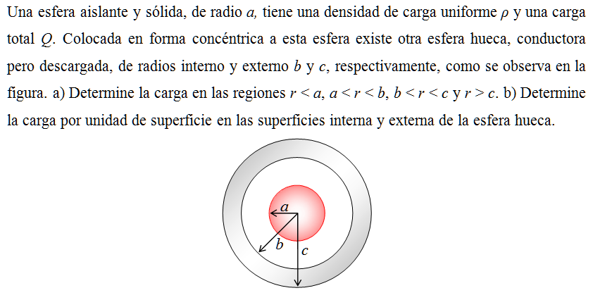 Una esfera aislante y sólida, de radio a, tiene una densidad de carga uniforme y una carga total Q. Colocada en forma concéntrica a esta esfera existe otra esfera hueca, conductora pero descargada, de radios interno y externo b y c, respectivamente, como se observa en la figura. a) Determine la carga en las regiones r < a, a < r < b, b < r < c y r > c. b) Determine la carga por unidad de superficie en las superficies interna y externa de la esfera hueca.