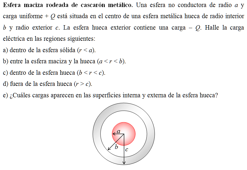 Esfera maciza rodeada de cascarón metálico. Una esfera no conductora de radio a y carga uniforme + Q está situada en el centro de una esfera metálica hueca de radio interior b y radio exterior c. La esfera hueca exterior contiene una carga – Q. Halle la carga eléctrica en las regiones siguientes: