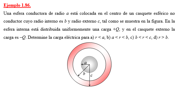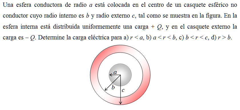 Una esfera conductora de radio a está colocada en el centro de un casquete esférico no conductor cuyo radio interno es b y radio externo c, tal como se muestra en la figura. En la esfera interna está distribuida uniformemente una carga + Q, y en el casquete externo la carga es – Q. Determine la carga eléctrica para a) r < a, b) a < r < b, c) b < r < c, d) r > b.