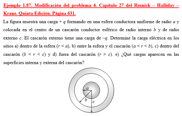 La figura muestra una carga + q formando en una esfera conductora uniforme de radio a y colocada en el centro de un cascarón conductor esférico de radio interno b y de radio externo c. El cascarón externo tiene una carga de – q. Determine la carga eléctrica en los sitios a) dentro de la esfera (r < a), b) entre la esfera y el cascarón (a < r < b), c) dentro del cascarón (b < r < c) y d) fuera del cascarón (r > c). e) ¿Qué cargas aparecen en las superficies interna y externa del cascarón?