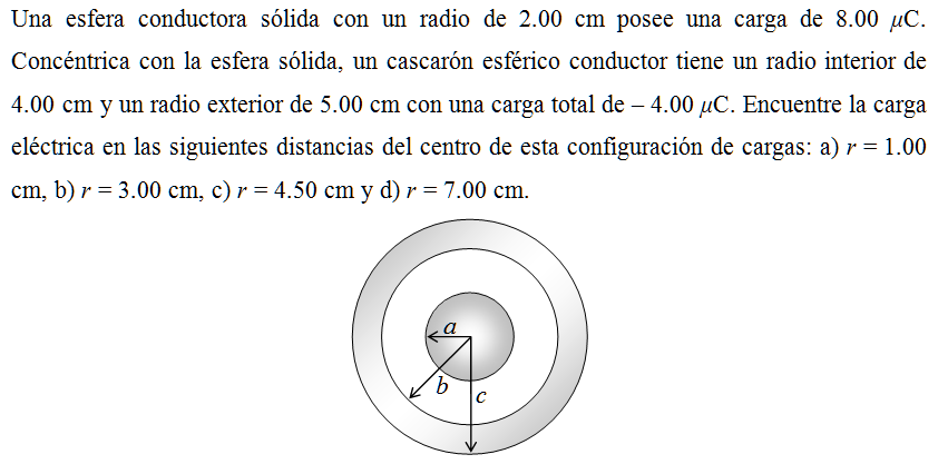 Una esfera conductora sólida con un radio de 2.00 cm posee una carga de 8.00 μC. Concéntrica con la esfera sólida, un cascarón esférico conductor tiene un radio interior de 4.00 cm y un radio exterior de 5.00 cm con una carga total de – 4.00 μC. Encuentre la carga eléctrica en las siguientes distancias del centro de esta configuración de cargas: a) r = 1.00 cm, b) r = 3.00 cm, c) r = 4.50 cm y d) r = 7.00 cm.