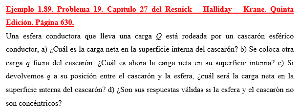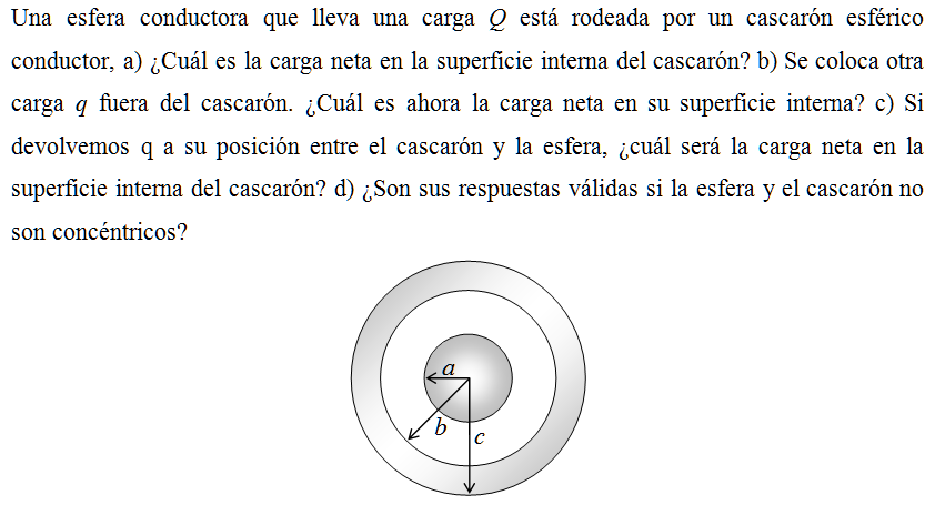 Una esfera conductora que lleva una carga Q está rodeada por un cascarón esférico conductor, a) ¿Cuál es la carga neta en la superficie interna del cascarón? b) Se coloca otra carga q fuera del cascarón. ¿Cuál es ahora la carga neta en su superficie interna? c) Si devolvemos q a su posición entre el cascarón y la esfera, ¿cuál será la carga neta en la superficie interna del cascarón? d) ¿Son sus respuestas válidas si la esfera y el cascarón no son concéntricos?