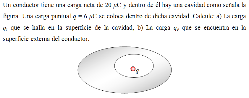 Un conductor tiene una carga neta de 20 μC y dentro de él hay una cavidad como señala la figura. Una carga puntual q = 6 μC se coloca dentro de dicha cavidad. Calcule: a) La carga qi que se halla en la superficie de la cavidad, b) La carga qe que se encuentra en la superficie externa del conductor.