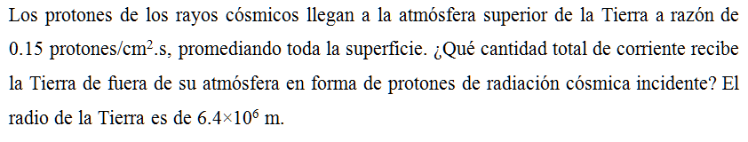 Los protones de los rayos cósmicos llegan a la atmósfera superior de la Tierra a razón de 0.15 protones/cm2.s, promediando toda la superficie. ¿Qué cantidad total de corriente recibe la Tierra de fuera de su atmósfera en forma de protones de radiación cósmica incidente? El radio de la Tierra es de 6.4×106 m.