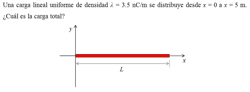 Una carga lineal uniforme de densidad λ = 3.5 nC/m se distribuye desde x = 0 a x = 5 m. ¿Cuál es la carga total?