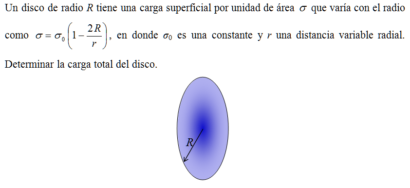 Un disco de radio R tiene una carga superficial por unidad de área que varía con el radio como \( \displaystyle \sigma=\sigma_0\left(1-\frac{2R}{r}\right)\), en donde σ0 es una constante y r una distancia variable radial. Determinar la carga total del disco.
