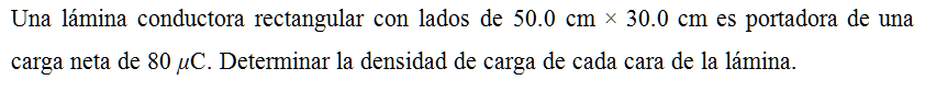 Una lámina conductora rectangular con lados de 50.0 cm × 30.0 cm es portadora de una carga neta de 80 μC. Determinar la densidad de carga de cada cara de la lámina.