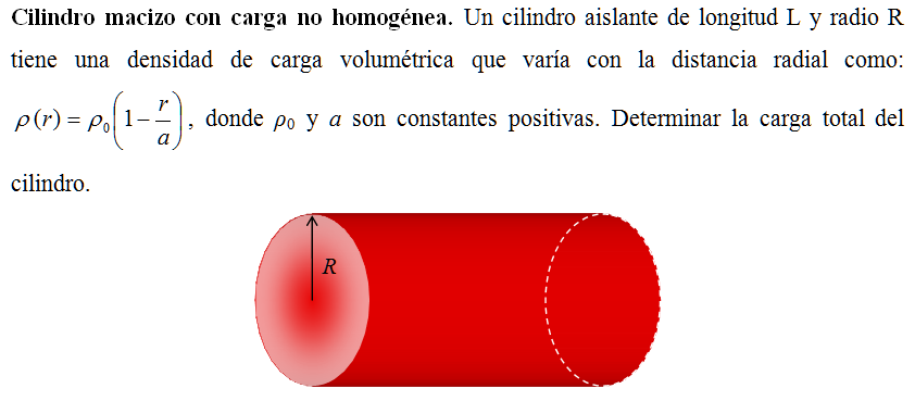 Cilindro macizo con carga no homogénea. Un cilindro aislante de longitud L y radio R tiene una densidad de carga volumétrica que varía con la distancia radial como: \( \displaystyle \rho(r)= \rho_0\left(1-\frac{r}{a}\right) \), donde ρ0 y a son constantes positivas. Determinar la carga total del cilindro.