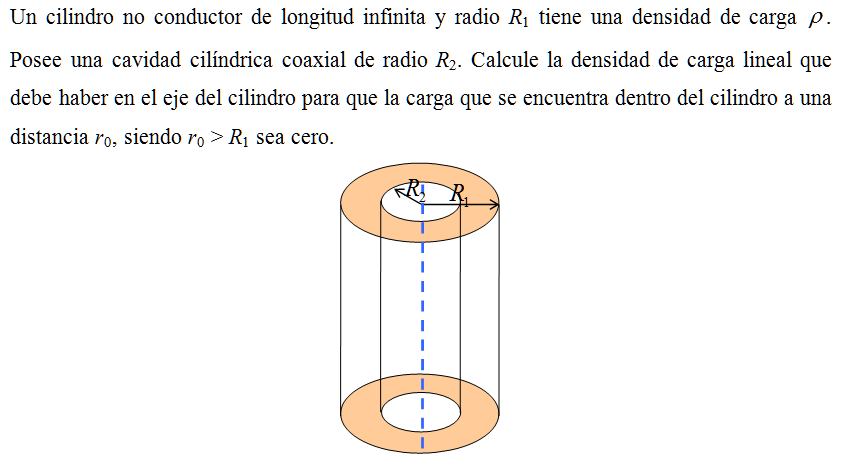 Un cilindro no conductor de longitud infinita y radio R1 tiene una densidad de carga . Posee una cavidad cilíndrica coaxial de radio R2. Calcule la densidad de carga lineal que debe haber en el eje del cilindro para que la carga que se encuentra dentro del cilindro a una distancia r0, siendo r0 > R1 sea cero.