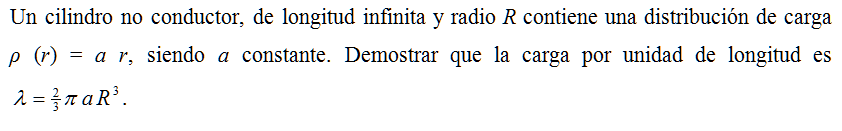 Un cilindro no conductor, de longitud infinita y radio R contiene una distribución de carga ρ (r) = a r, siendo a constante. Demostrar que la carga por unidad de longitud es \( \displaystyle \lambda = \frac{2}{3}\pi a R^3 \).
