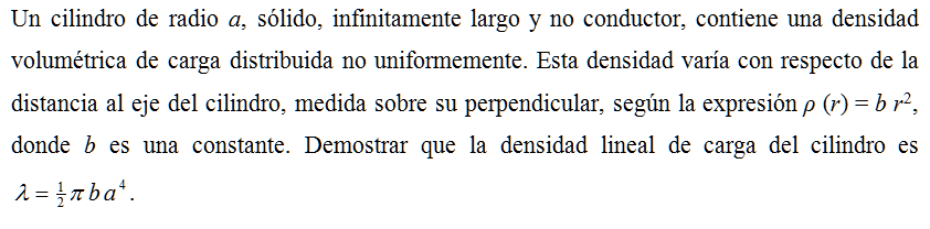 Un cilindro de radio a, sólido, infinitamente largo y no conductor, contiene una densidad volumétrica de carga distribuida no uniformemente. Esta densidad varía con respecto de la distancia al eje del cilindro, medida sobre su perpendicular, según la expresión ρ (r) = b r2, donde b es una constante. Demostrar que la densidad lineal de carga del cilindro es \( \displaystyle \lambda = \frac{1}{2}\pi b a^4 \).
