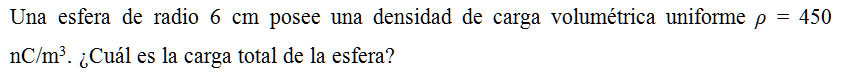 Una esfera de radio 6 cm posee una densidad de carga volumétrica uniforme ρ = 450 nC/m3. ¿Cuál es la carga total de la esfera?