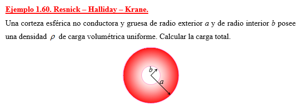 Una corteza esférica no conductora y gruesa de radio exterior a y de radio interior b posee una densidad ρ de carga volumétrica uniforme. Calcular la carga total.