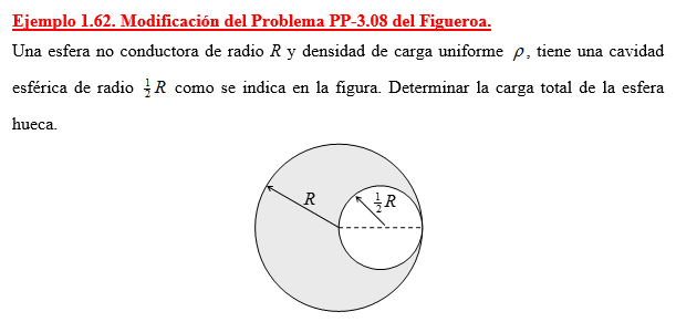 Una esfera no conductora de radio R y densidad de carga uniforme ρ, tiene una cavidad esférica de radio \( \displaystyle \frac{1}{2}R \) como se indica en la figura. Determinar la carga total de la esfera hueca.