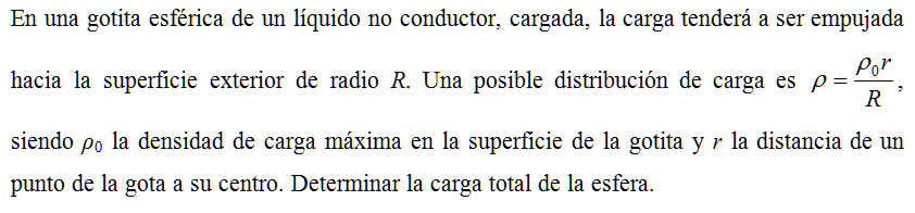En una gotita esférica de un líquido no conductor, cargada, la carga tenderá a ser empujada hacia la superficie exterior de radio R. Una posible distribución de carga es \( \displaystyle \rho = \frac{\rho_0 r}{R}\), siendo ρ0 la densidad de carga máxima en la superficie de la gotita y r la distancia de un punto de la gota a su centro. Determinar la carga total de la esfera.