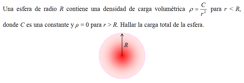 Una esfera de radio R contiene una densidad de carga volumétrica \( \displaystyle \rho = \frac{C}{r^2} \) para r < R, donde C es una constante y ρ = 0 para r > R. Hallar la carga total de la esfera.
