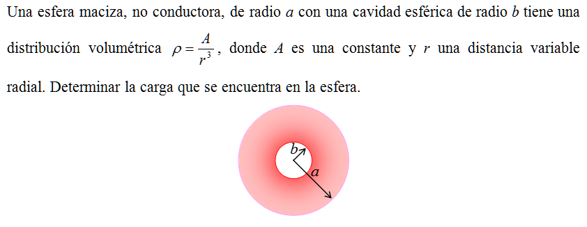 Una esfera maciza, no conductora, de radio a con una cavidad esférica de radio b tiene una distribución volumétrica \( \displaystyle \rho = \frac{a}{r^3} \), donde A es una constante y r una distancia variable radial. Determinar la carga que se encuentra en la esfera.