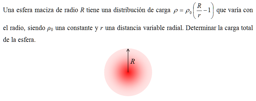 Una esfera maciza de radio R tiene una distribución de carga \( \displaystyle \rho = \rho_0 \left(\frac{R}{r}-1\right) \) que varía con el radio, siendo ρ0 una constante y r una distancia variable radial. Determinar la carga total de la esfera.