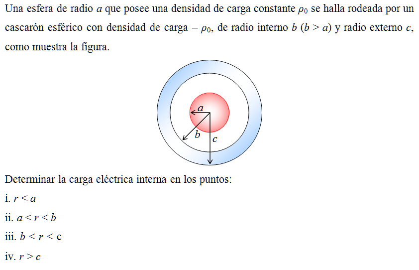 Una esfera de radio a que posee una densidad de carga constante ρ0 se halla rodeada por un cascarón esférico con densidad de carga – ρ0, de radio interno b (b > a) y radio externo c, como muestra la figura.