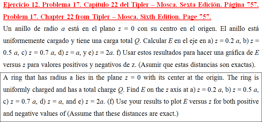 Un anillo de radio a está en el plano z = 0 con su centro en el origen. El anillo está uniformemente cargado y tiene una carga total Q. Calcular E en el eje en a) z = 0.2 a, b) z = 0.5 a, c) z = 0.7 a, d) z = a, y e) z = 2a. f) Usar estos resultados para hacer una gráfica de E versus z para valores positivos y negativos de z. (Asumir que estas distancias son exactas).