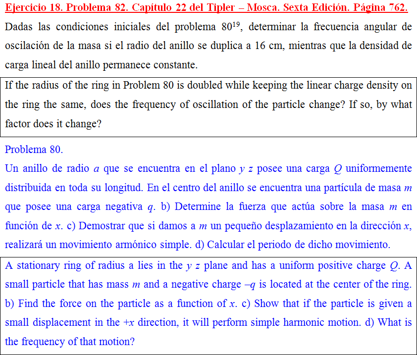 Dadas las condiciones iniciales del problema 80, determinar la frecuencia angular de oscilación de la masa si el radio del anillo se duplica a 16 cm, mientras que la densidad de carga lineal del anillo permanece constante.